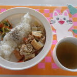 主食・・・ごはん 主菜・・・麻婆豆腐 副菜・・・バンサンスー お汁・・・中華スープ