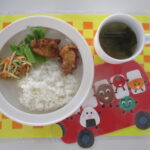*今日の給食* ・ごはん ・デミソースハンバーグ ・大根サラダ ・コンソメスープ *今日のおやつ* ・お茶 ・わかめおにぎり