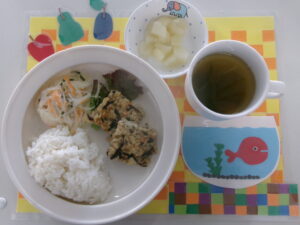 9月9日(火) 公開日: 2025年9月9日更新日: 2025年9月9日著者: kabutodaiカテゴリー: 兜台保育園給食献立 主食・・・ごはん 主菜・・・鶏つくねひじき焼き 副菜・・・春雨マヨサラダ お汁・・・みそ汁 もも 関連記事 7月22日(月) 主菜・・・高野豆腐と野菜の煮物 副菜・・・青菜のお浸し お汁・・・みそ汁 ひじきふりかけ 公開日: 2024年7月22日更新日: 2024年7月22日著者: kabutodaiカテゴリー: 兜台保育園給食献立 8月2日(月) 主食・・・ごはん 主菜・・・肉じゃが 副菜・・・おひたし お汁・・・すまし汁 公開日: 2021年8月2日更新日: 2021年8月2日著者: kabutodaiカテゴリー: 兜台保育園給食献立 5月11日(木) 主食・・・ごはん 主菜・・・ローストチキン 副菜・・・法蓮草サラダ お汁・・・みそ汁 公開日: 2023年5月11日更新日: 2023年5月11日著者: kabutodaiカテゴリー: 兜台保育園給食献立