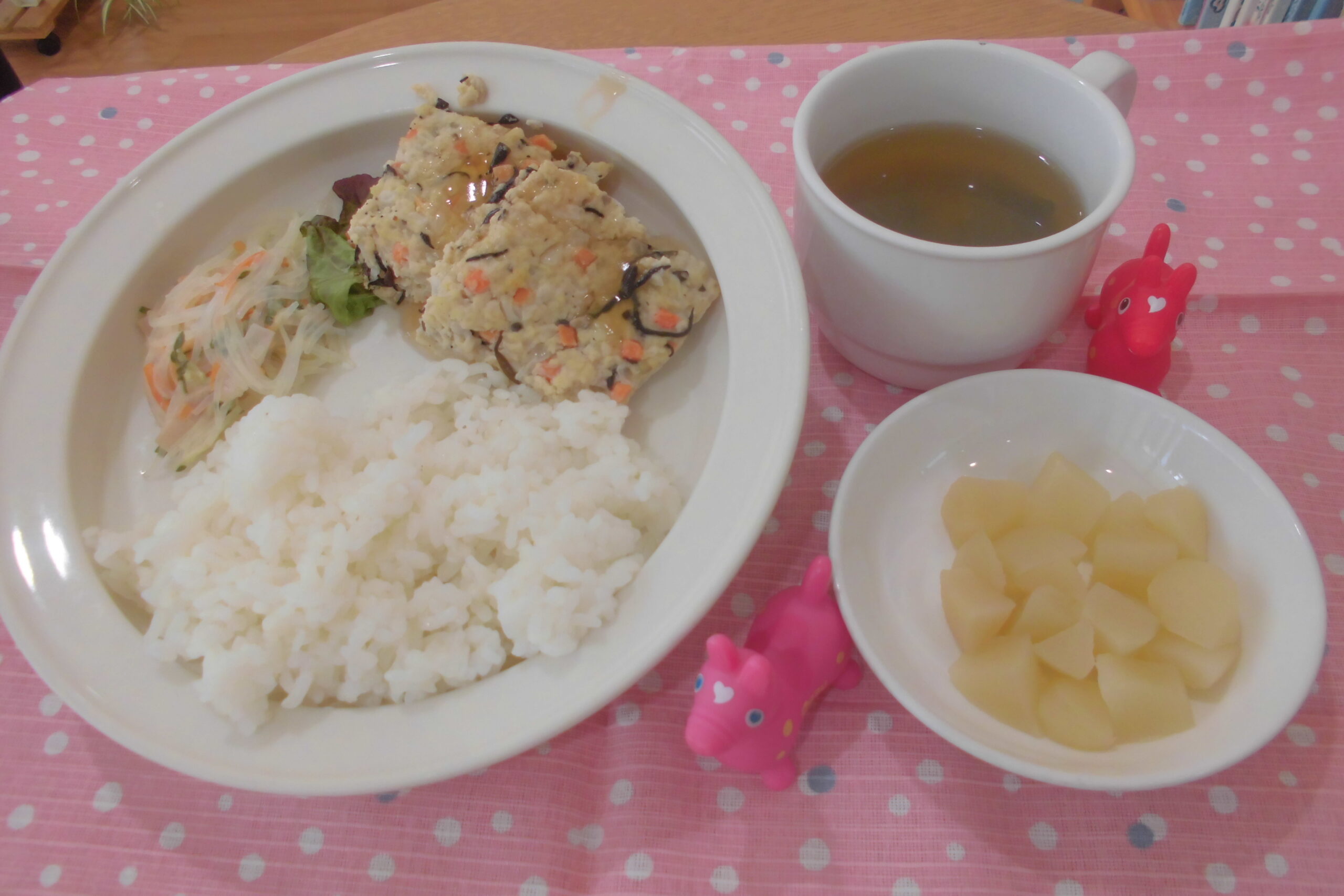 9月9日(火) 公開日: 2025年9月9日更新日: 2025年9月9日著者: aikouminoriカテゴリー: 愛光みのりこども園給食献立 ごはん 鶏つくねひじき焼き 春雨マヨサラダ みそ汁 もも 関連記事 13 2月13日(月) ごはん みそ汁 鮭の塩焼き 青菜のお浸し ひじきふりかけ 公開日: 2023年2月13日更新日: 2023年2月13日著者: aikouminoriカテゴリー: 愛光みのりこども園給食献立 13 3月13日(金) ごはん デミソースハンバーグ 切干のさっぱりサラダ コンソメス […] 公開日: 2026年3月13日更新日: 2026年3月13日著者: aikouminoriカテゴリー: 愛光みのりこども園, 愛光みのりこども園給食献立 30 9月30日(月) ごはん ウインナーの豆乳シチュー フレンチサラダ じゃこゆかりふりかけ 公開日: 2024年9月30日更新日: 2024年9月30日著者: aikouminoriカテゴリー: 愛光みのりこども園給食献立