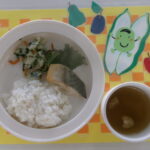 *今日の給食* ・ごはん ・サバの照り焼き ・キャベツの和え物 ・みそ汁 *今日のおやつ* ・お茶 ・サケわかめおにぎり