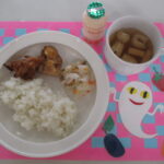 主食・・・ごはん 主菜・・・鶏肉の唐揚げ 副菜・・・キャベツの甘酢和え お汁・・・みそ汁 乳酸菌飲料
