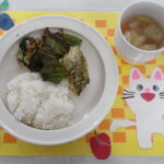 主食・・・ごはん 主菜・・・タラの磯部揚げ 副菜・・・香り和え お汁・・・けんちん汁