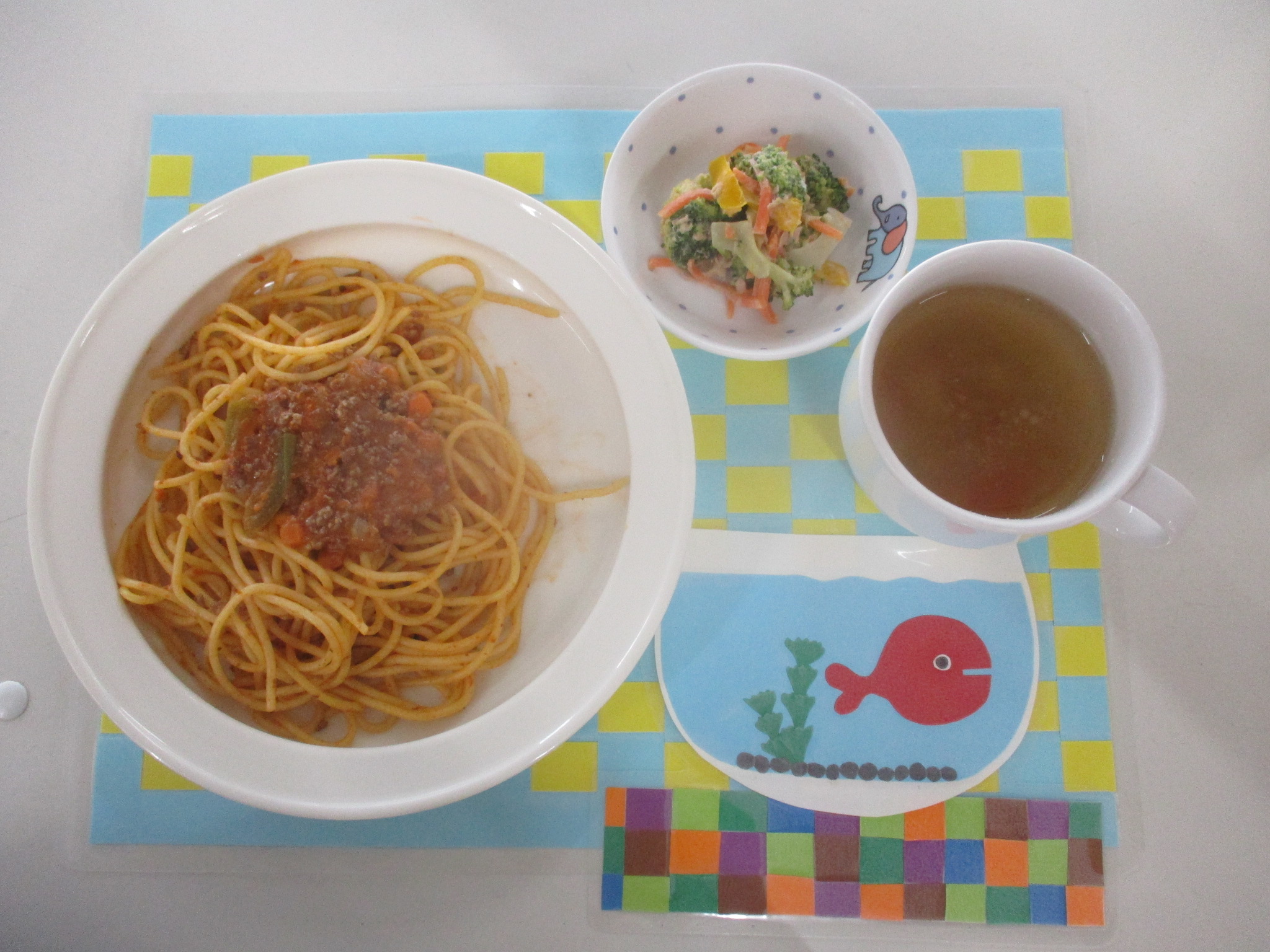 11月14日(金) 公開日: 2025年11月14日更新日: 2025年11月14日著者: kabutodaiカテゴリー: 兜台保育園給食献立 主食・・・ミートスパゲティー 副菜・・・ブロッコリーサラダ お汁・・・コンソメスープ (乳児) *ごはん *ミートソースマカロニ 関連記事 8月9日(火) 主食・・・麦ごはん 主菜・・・麻婆豆腐 副菜・・・ナムル お汁・・・中華スープ デザート・・・パイン 公開日: 2022年8月9日更新日: 2022年8月9日著者: kabutodaiカテゴリー: 兜台保育園給食献立 12 2月12日(火) 主食・・・ごはん 主菜・・・高野豆腐と野菜の煮物 副菜・・・なめ茸和え お汁・・・そうめん汁 公開日: 2019年2月12日更新日: 2019年2月12日著者: kabutodaiカテゴリー: 兜台保育園, 兜台保育園給食献立 4月16日(木) 主食・・・ご飯 主菜・・・鮭のマヨドレ焼き 副菜・・・信田和え お汁・・・みそ汁 ひじきふりかけ 公開日: 2020年4月16日更新日: 2020年4月17日著者: kabutodaiカテゴリー: 兜台保育園給食献立
