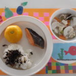 主食・・・ごはん 主菜・・・鮭の塩焼き 副菜・・・収穫煮 ひじきふりかけ みかん