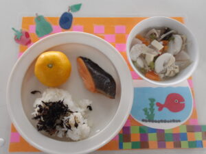 11月21日(金) 公開日: 2025年11月21日更新日: 2025年11月21日著者: kabutodaiカテゴリー: 兜台保育園給食献立 主食・・・ごはん 主菜・・・鮭の塩焼き 副菜・・・収穫煮 ひじきふりかけ みかん 関連記事 7月20日(月) 主食・・・ご飯 主菜・・・高野豆腐と野菜の煮物 副菜・・・ツナと青菜のポン酢和え お汁・・・そうめん汁 公開日: 2020年7月20日更新日: 2020年7月20日著者: kabutodaiカテゴリー: 兜台保育園給食献立 5月8日(木) 主菜・・・和風みそハンバーグ 副菜・・・マカロニサラダ お汁・・・みそ汁 パイン 公開日: 2025年5月8日更新日: 2025年5月8日著者: kabutodaiカテゴリー: 兜台保育園給食献立 11月15日(金) 主菜・・・高野麻婆 副菜・・・春雨マヨサラダ お汁・・・中華スープ 公開日: 2024年11月15日更新日: 2024年11月15日著者: kabutodaiカテゴリー: 兜台保育園給食献立