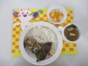 11月26日(水) 公開日: 2025年11月26日更新日: 2025年11月26日著者: kabutodaiカテゴリー: 兜台保育園給食献立 主食・・・麦ごはん 主菜・・・ひじきとれんこんの鶏つくね 副菜・・・マカロニサラダ お汁・・・みそ汁 フルーツミックス 関連記事 1月25日(木) 主食・・・ごはん 主菜・・・鮭の照り焼き 副菜・・・ごぼうサラダ お汁・・・みそ汁 公開日: 2024年1月25日更新日: 2024年1月25日著者: kabutodaiカテゴリー: 兜台保育園給食献立 7月15日(木) 主食・・・ごはん 主菜・・・デミソースハンバーグ 副菜・・・海藻サラダ お汁・・・コンソメスープ &nb […] 公開日: 2021年7月15日更新日: 2021年7月15日著者: kabutodaiカテゴリー: 兜台保育園給食献立 10月26日(木) 主食・・・ごはん 主菜・・・すき焼き煮 副菜・・・さくら漬け お汁・・・みそ汁 デザート・・・ヤクルト 公開日: 2023年10月26日更新日: 2023年10月26日著者: kabutodaiカテゴリー: 兜台保育園給食献立