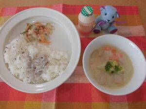 11月28日(金) 公開日: 2025年11月28日更新日: 2025年11月28日著者: aikouminoriカテゴリー: 愛光みのりこども園給食献立 ごはん ウインナーの豆乳シチュー ツナの海藻サラダ じゃこゆかりふりかけ 乳酸菌飲料 関連記事 27 10月27日(金) ・ごはん ・高野とひじきの鶏つくね焼き ・マカロニサラダ ・冬瓜汁 ・乳酸菌飲料 公開日: 2023年10月27日更新日: 2023年10月27日著者: aikouminoriカテゴリー: 愛光みのりこども園給食献立 07 1月7日(火) ごはん 松風焼き 紅白なます みそ汁 公開日: 2020年1月7日更新日: 2020年1月7日著者: aikouminoriカテゴリー: 愛光みのりこども園給食献立 23 7月23日(月) ごはん 高野豆腐と野菜の煮物 キャベツの梅じゃこ和え なめこ汁 公開日: 2018年7月23日更新日: 2018年7月31日著者: aikouminoriカテゴリー: 愛光みのりこども園給食献立