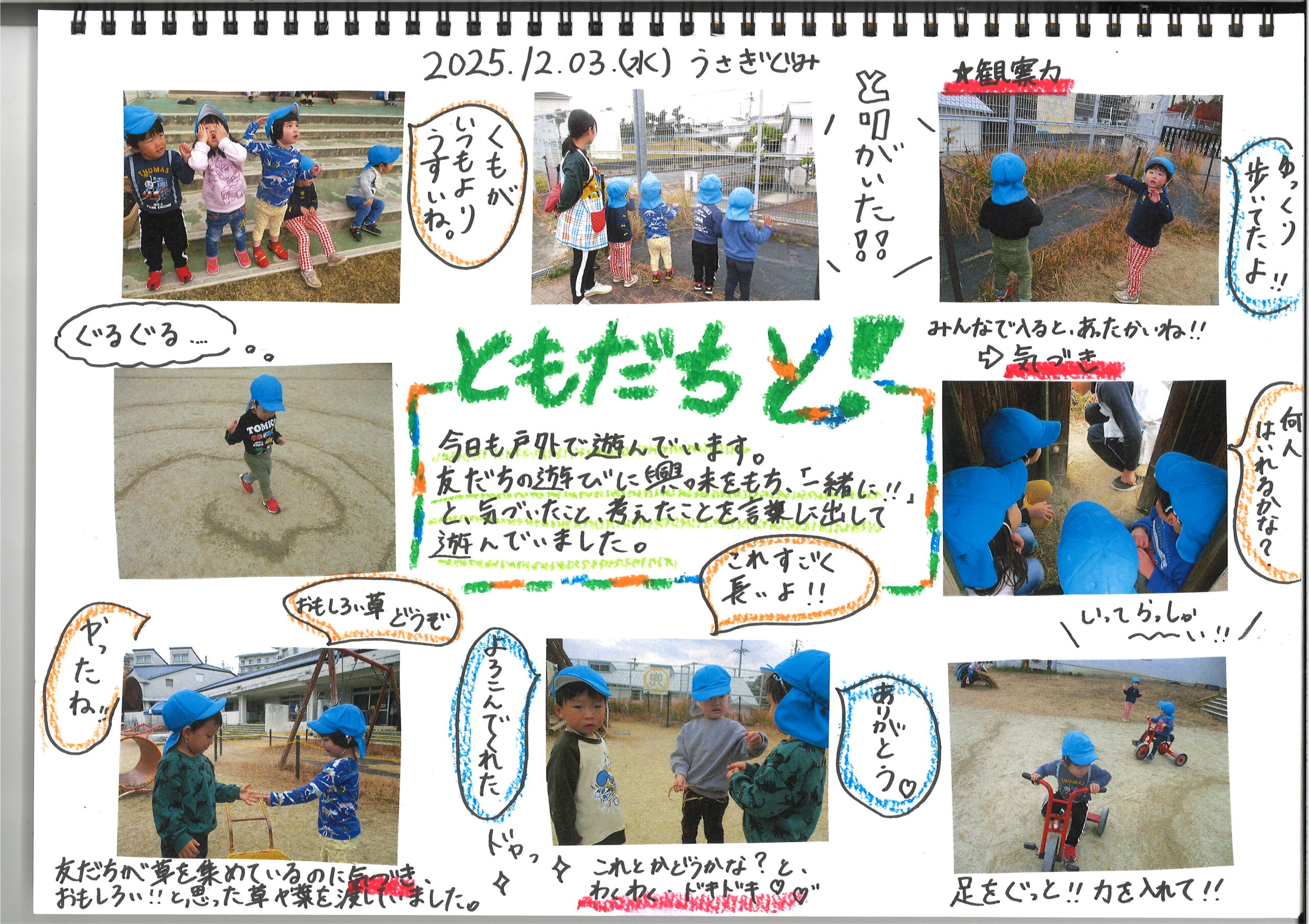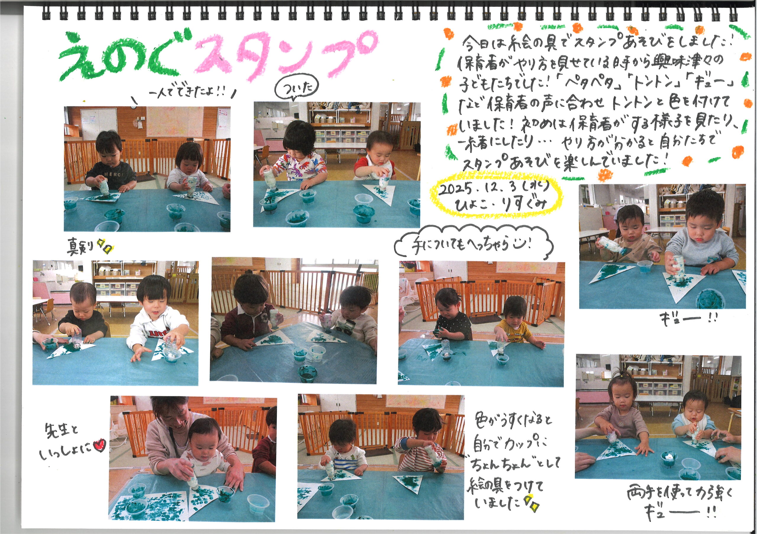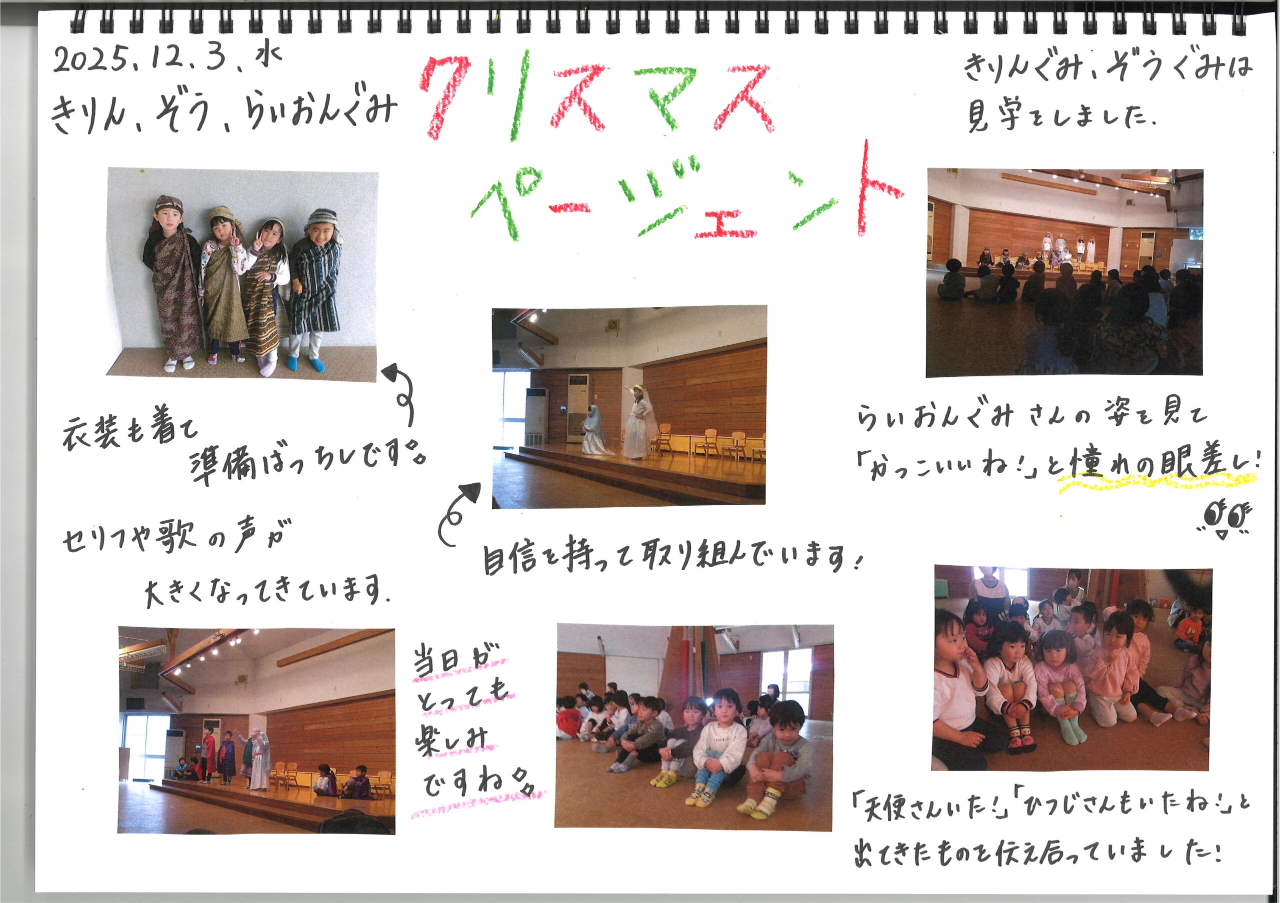 12月3日(水)今日の様子 公開日: 2025年12月3日更新日: 2025年12月3日著者: kabutodaiカテゴリー: 兜台保育園, 兜台保育園園ブログ ひよこ・りすぐみ うさぎぐみ きりん・ぞう・らいおんぐみ