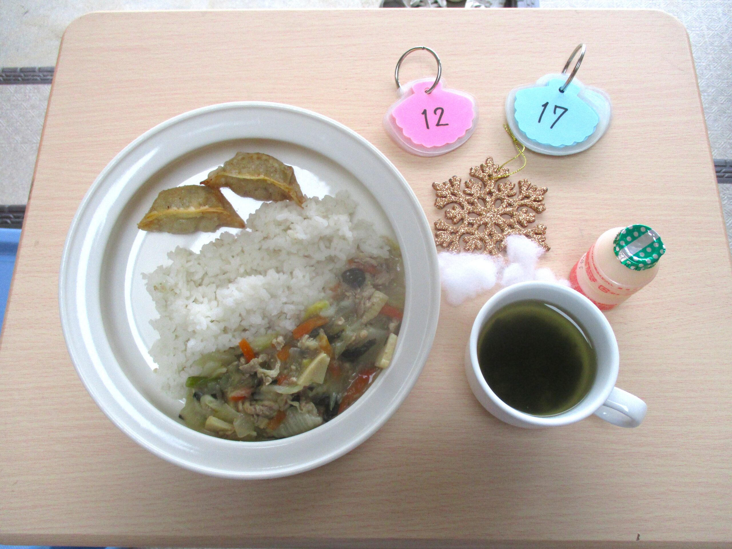 2025年12月17日(水) 公開日: 2025年12月17日更新日: 2025年12月17日著者: aikouカテゴリー: 愛光こども園, 愛光こども園給食献立 *今日の給食* ・麦ごはん ・八宝菜 ・揚げぎょうざ ・わかめスープ ・乳酸菌飲料 *今日のおやつ* ・牛乳 ・ブロッコリーとツナのサンド