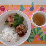 主食・・・ごはん 主菜・・・デミソースハンバーグ 副菜・・・温野菜サラダ お汁・・・コンソメスープ