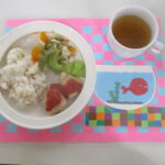 *今日の給食* ・麦ごはん ・鶏肉のトマトソースかけ ・フレンチサラダ ・みそ汁 *今日のおやつ* ・牛乳 ・お楽しみパフェ