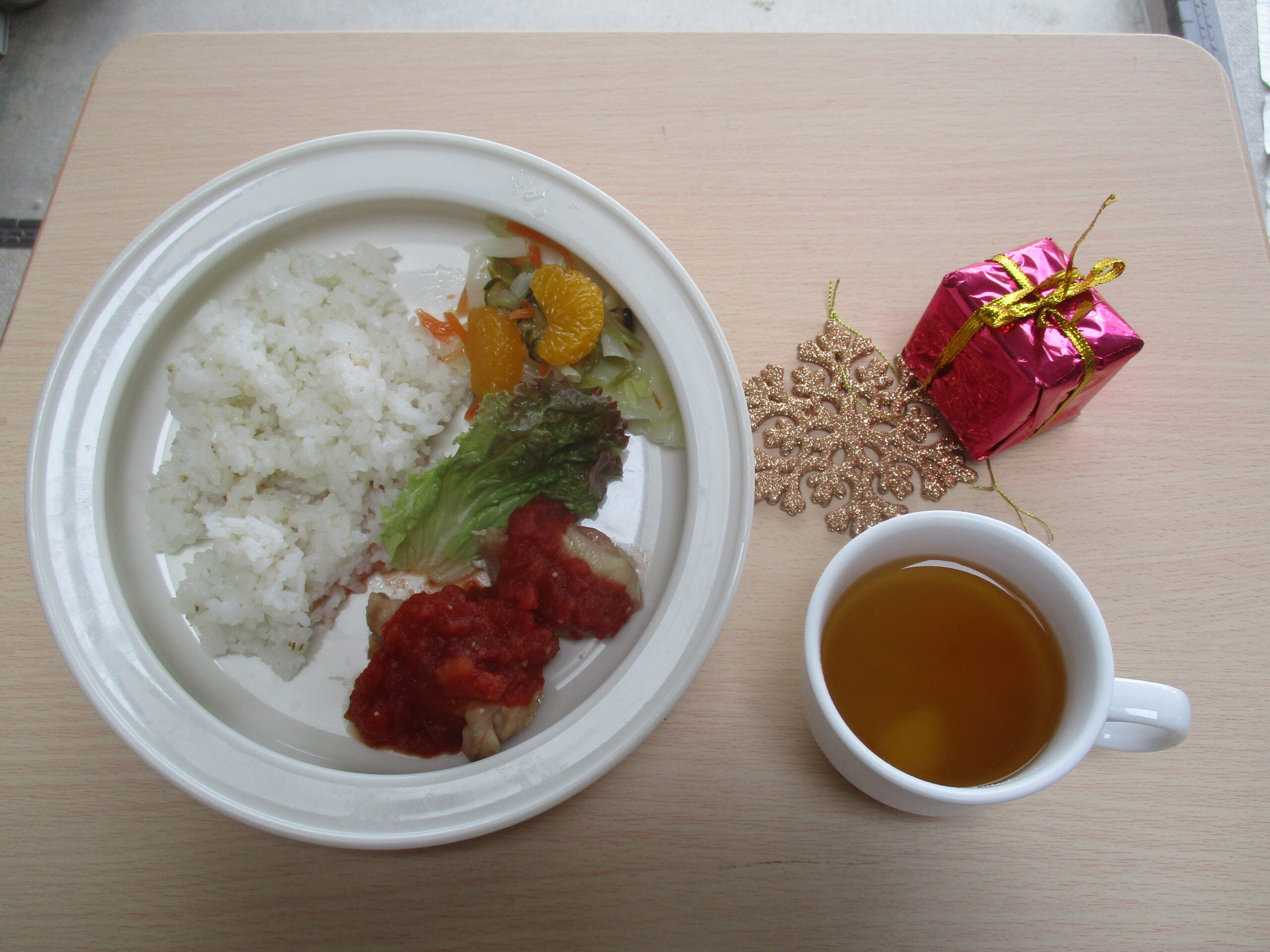 2025年12月24日(水) 公開日: 2025年12月24日更新日: 2025年12月24日著者: aikouカテゴリー: 愛光こども園, 愛光こども園給食献立 *今日の給食* ・麦ごはん ・鶏肉のトマトソースかけ ・フレンチサラダ ・みそ汁 *今日のおやつ* ・牛乳 ・お楽しみパフェ