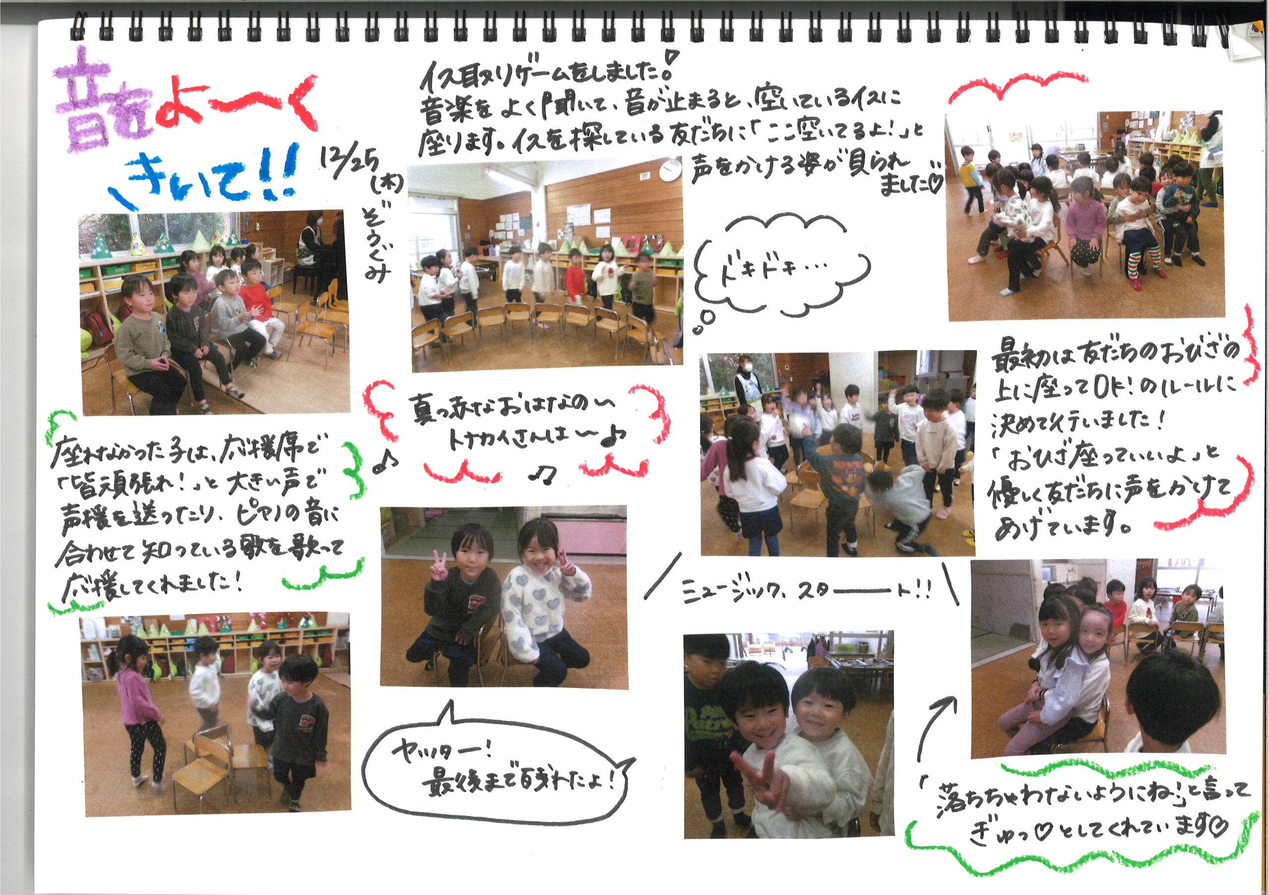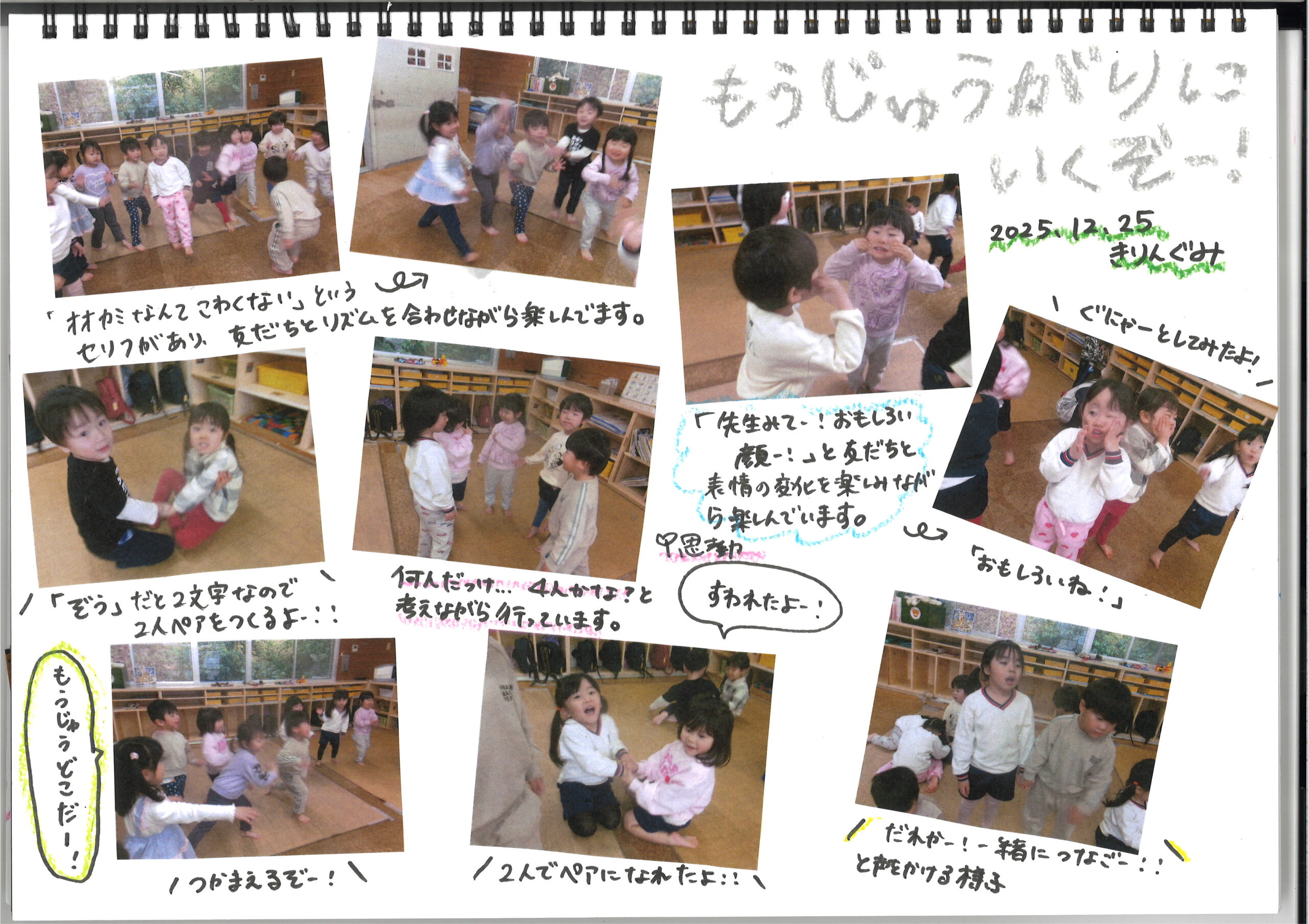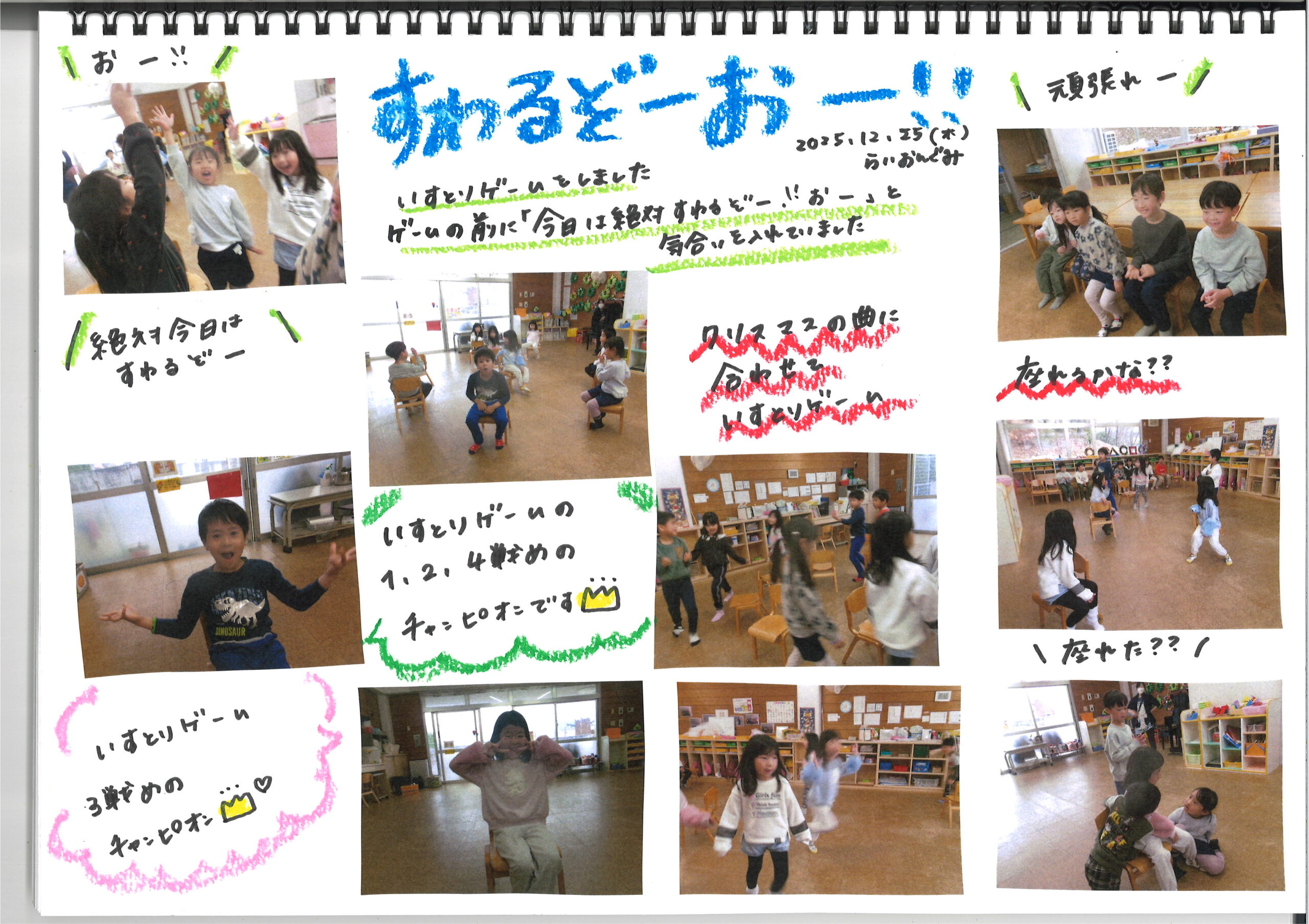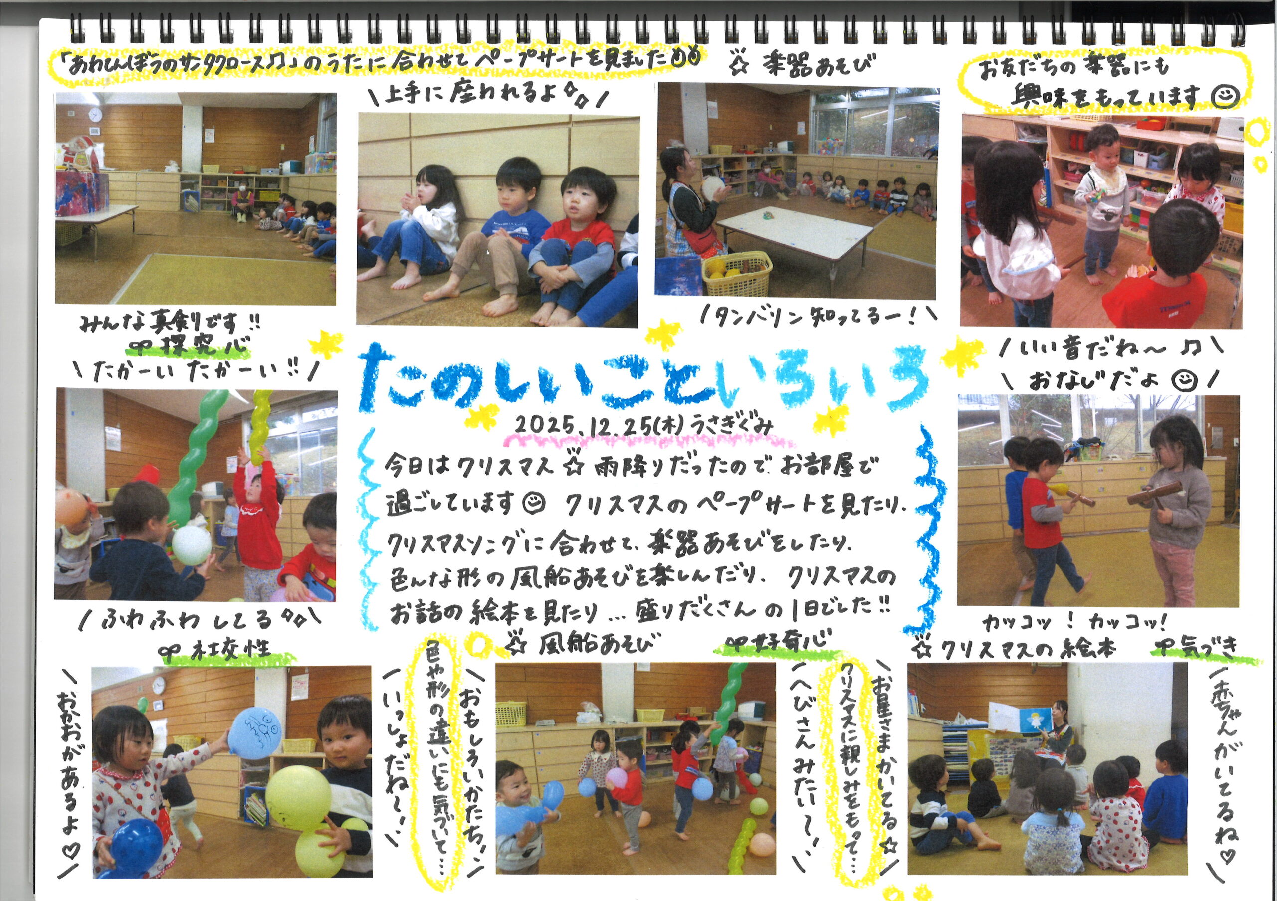 12月25日(木) 今日の様子 公開日: 2025年12月25日更新日: 2025年12月25日著者: kabutodaiカテゴリー: 兜台保育園園ブログ ひよこ・りす組 うさぎ組 きりん組 ぞう組 らいおん組 関連記事 11月20日(金) 今日の様子 ひよこぐみ クリスマスに向けてお部屋にツリーを飾る為、 緑の画用紙にシール貼りをしました。 指先を器用に使い、夢中になって貼っていました。 前回ペンでお絵描きし […] 公開日: 2020年11月20日更新日: 2020年11月20日著者: kabutodaiカテゴリー: 兜台保育園園ブログ 12月1日(火) 今日の様子 今日からドキュメントを再開しました。 玄関の机に掲示していますので、 ご覧ください。 見る時の密集を避けるために、 ホームページにも載せていますので ゆっくりご […] 公開日: 2020年12月1日更新日: 2020年12月1日著者: kabutodaiカテゴリー: 兜台保育園園ブログ 10月19日(木)今日の様子 ひよこぐみ・りすぐみ うさぎぐみ きりんぐみ ぞうぐみ らいおんぐみ 公開日: 2023年10月19日更新日: 2023年10月19日著者: kabutodaiカテゴリー: 兜台保育園園ブログ
