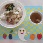 *今日の給食* ・ごはん ・高野豆腐と野菜の煮物 ・青菜のお浸し ・みそ汁 ・じゃこふりかけ *今日のおやつ* ・牛乳 ・豆乳蒸しパン