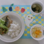 主食・・・ごはん 主菜・・・鯖のみそ煮 副菜・・・おかか和え お汁・・・すまし汁 フルーツミックス