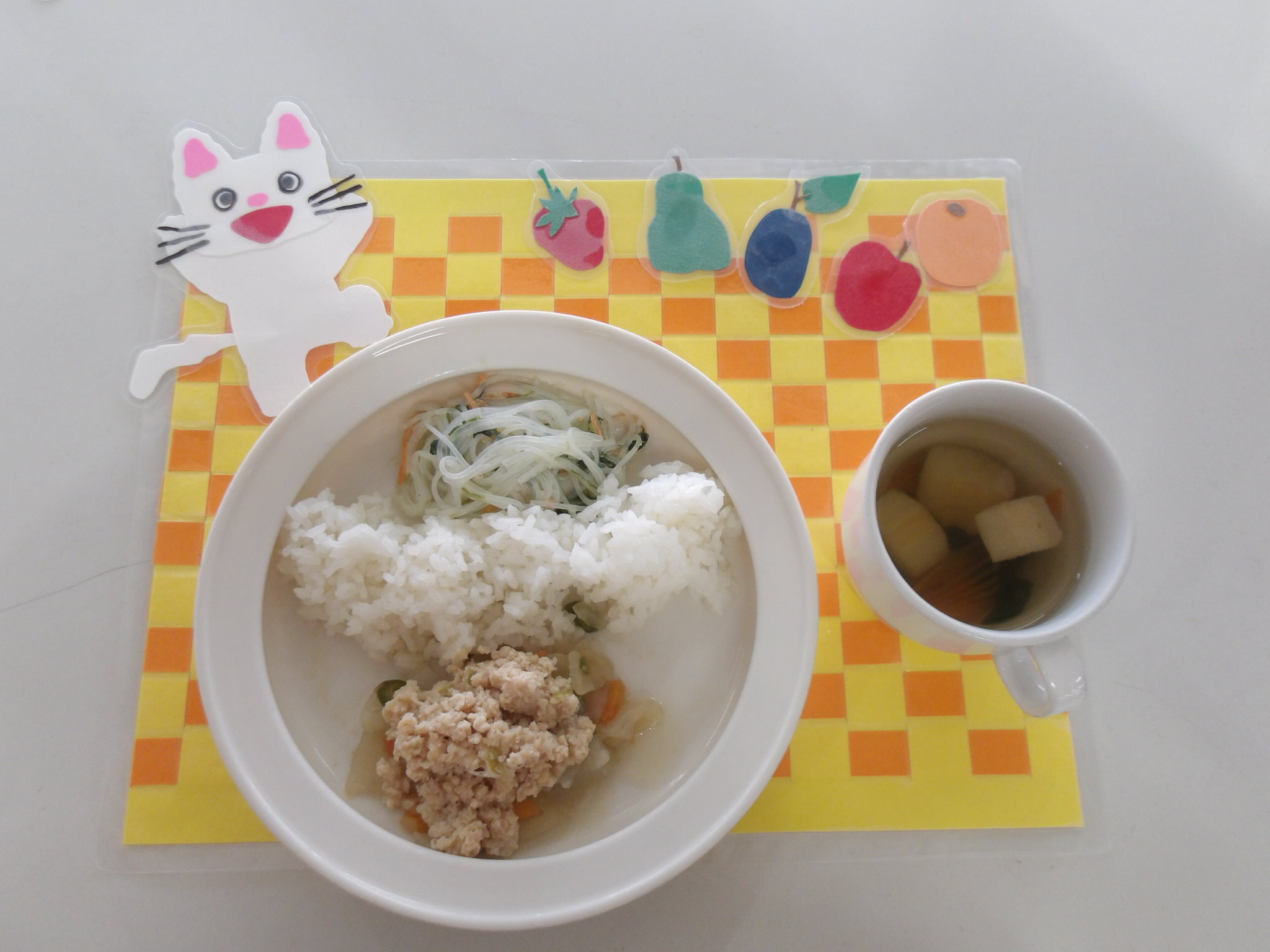 2月9日(月) 公開日: 2026年2月9日更新日: 2026年2月9日著者: kabutodaiカテゴリー: 兜台保育園給食献立 主食・・・ごはん 主菜・・・大根の肉みそかけ 副菜・・・春雨とほぅれん草のマヨサラダ お汁・・・すまし汁 関連記事 12月14日(月) 主食・・・ごはん 主菜・・・高野豆腐と野菜の煮物 副菜・・・キャベツときのこのポン酢和え お汁・・・すまし汁 じゃこふりかけ 公開日: 2020年12月14日更新日: 2020年12月14日著者: kabutodaiカテゴリー: 兜台保育園給食献立 5月21日(木) 主菜・・・スパゲッティーナポリタン 副菜・・・ブロッコリーサラダ お汁・・・コンソメスープ デザート・・・オレンジゼリー 公開日: 2020年5月21日更新日: 2020年5月21日著者: kabutodaiカテゴリー: 兜台保育園給食献立 2月14日(金) 主菜・・・鶏の照り焼き 副菜・・・小松菜の昆布和え お汁・・・すま汁汁 公開日: 2025年2月14日更新日: 2025年2月14日著者: kabutodaiカテゴリー: 兜台保育園給食献立