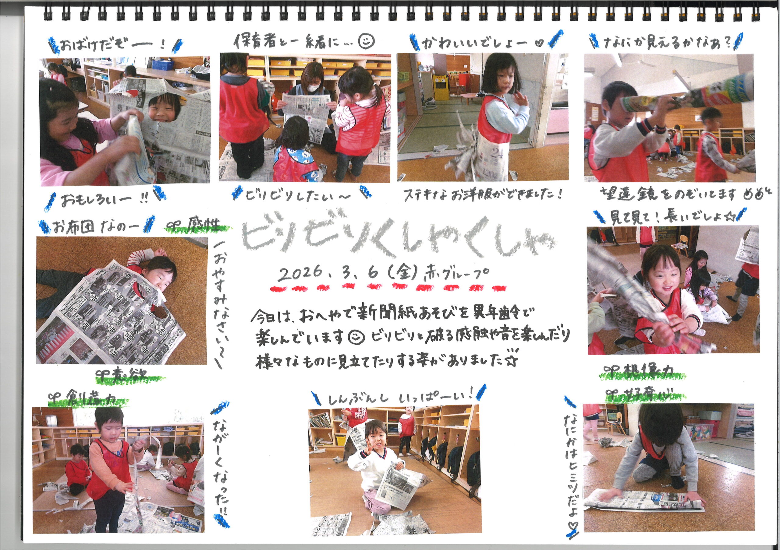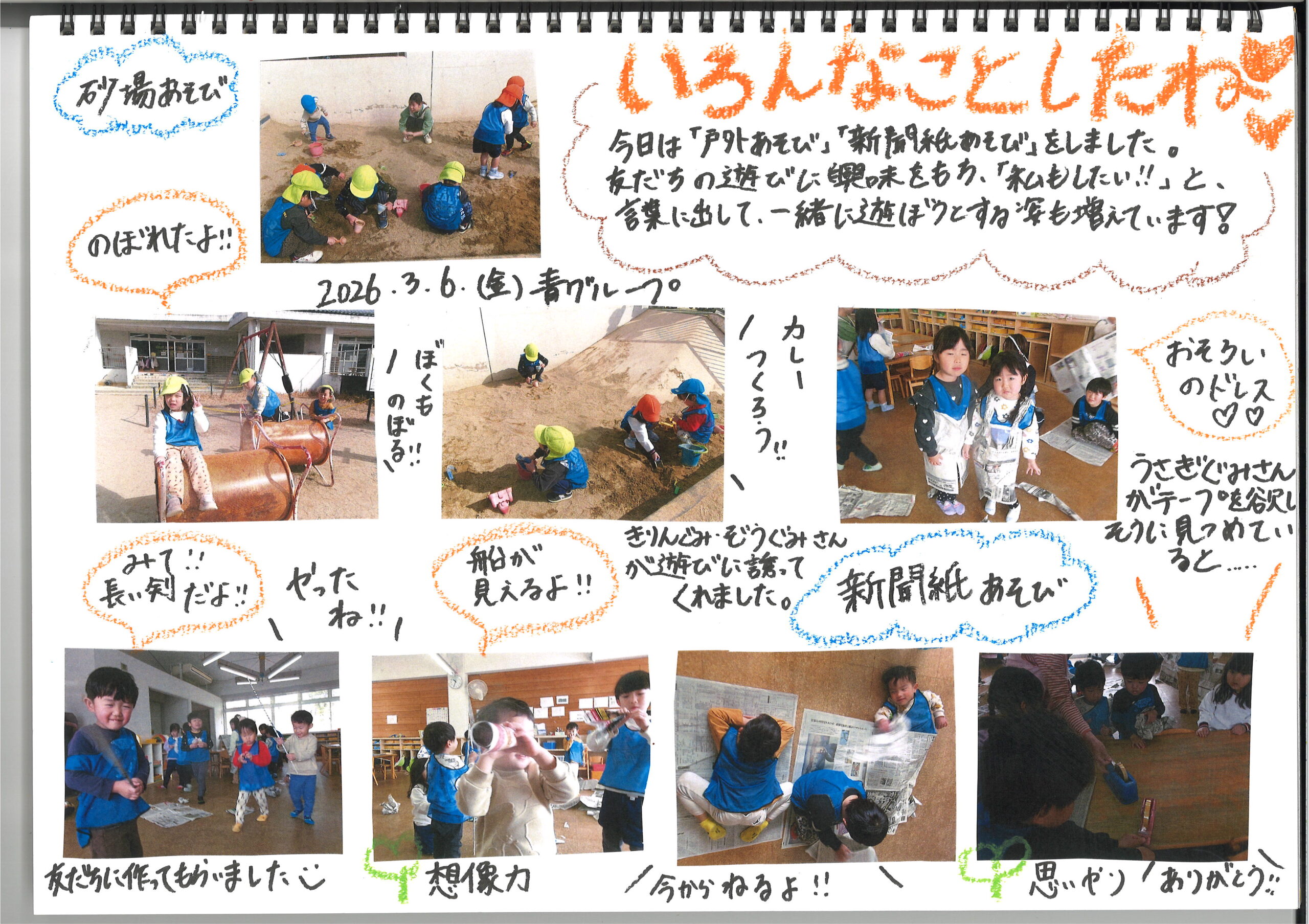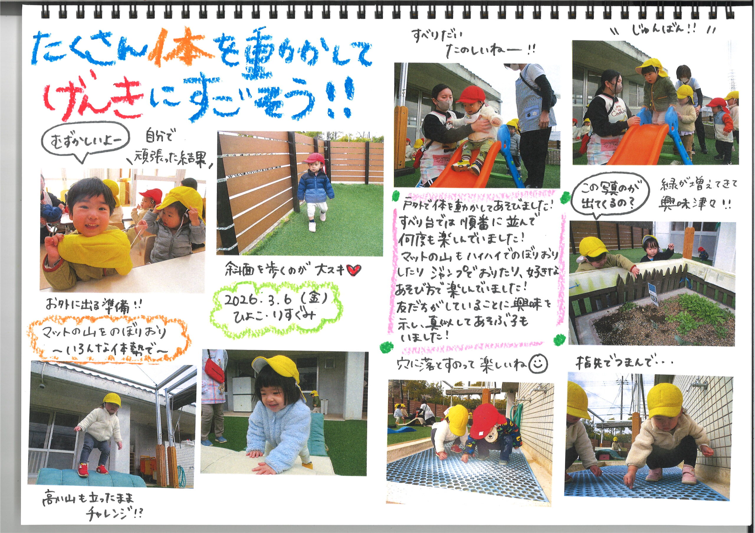3月6日(金)今日の様子 公開日: 2026年3月6日更新日: 2026年3月6日著者: kabutodaiカテゴリー: 兜台保育園園ブログ ひよこ・りす組 赤グループ 青グループ 黄グループ 関連記事 7月31日(木)今日の様子 ひよこ組・りす組 うさぎ組 きりん組 ぞう組 らいおん組 公開日: 2025年7月31日更新日: 2025年7月31日著者: kabutodaiカテゴリー: 兜台保育園園ブログ 1月21日(火) 今日の様子 ひよこ・りす組 うさぎ組 きりん組 ぞう組 らいおん組 公開日: 2025年1月21日更新日: 2025年1月21日著者: kabutodaiカテゴリー: 兜台保育園, 兜台保育園園ブログ 1月23日(月)今日の様子 ひよこぐみ りすぐみ うさぎぐみ きりんぐみ ぞうぐみ らいおんぐみ 公開日: 2023年1月24日更新日: 2023年1月24日著者: kabutodaiカテゴリー: 兜台保育園園ブログ