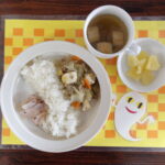 *今日の給食* ・ごはん ・すき焼き煮 ・さくら漬け ・みそ汁 ・パイン *今日のおやつ* ・お茶 ・高野そぼろおにぎり