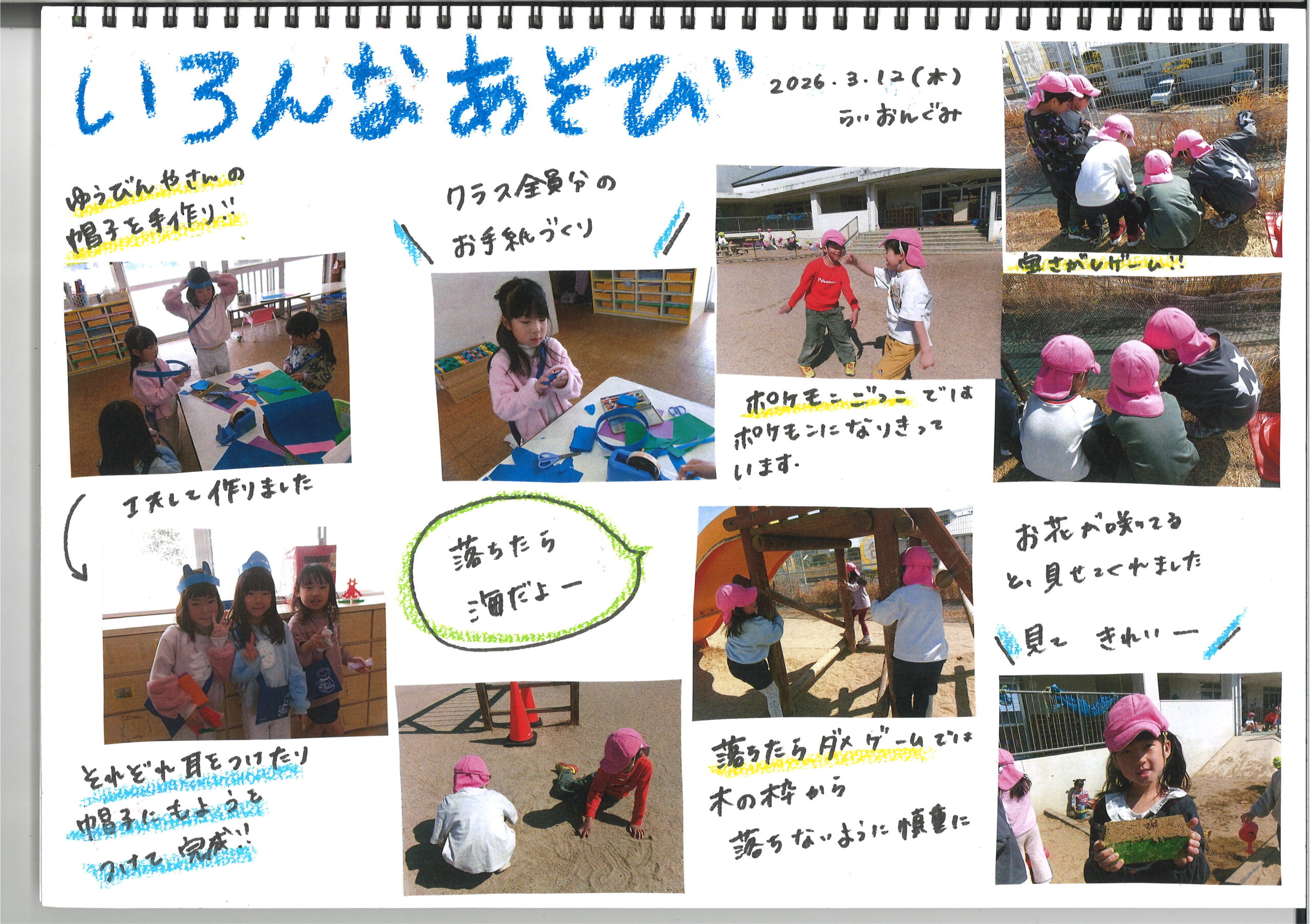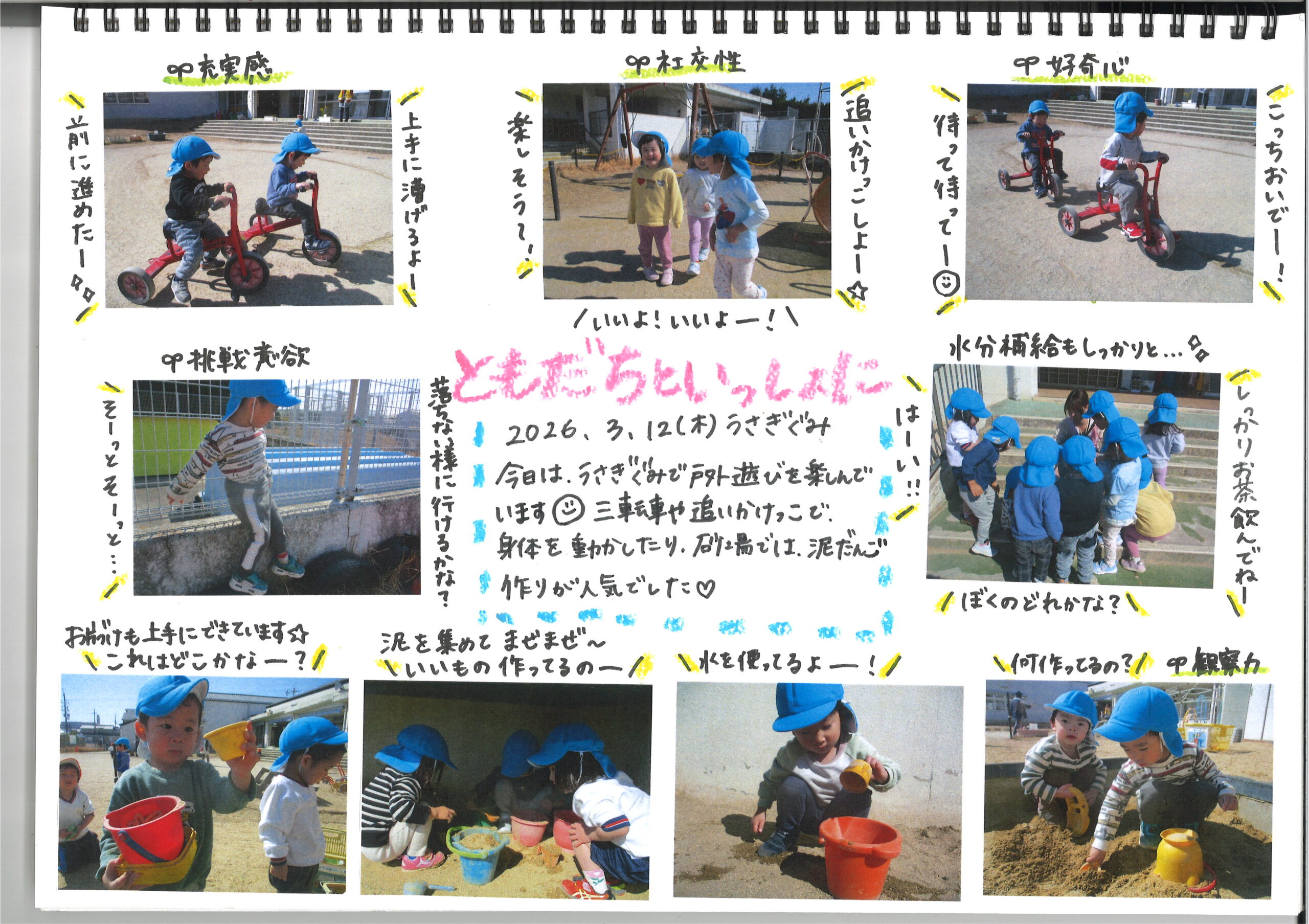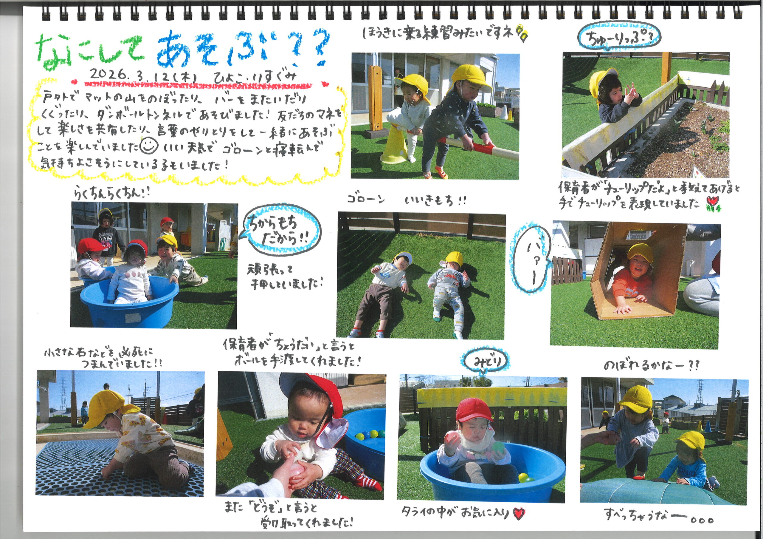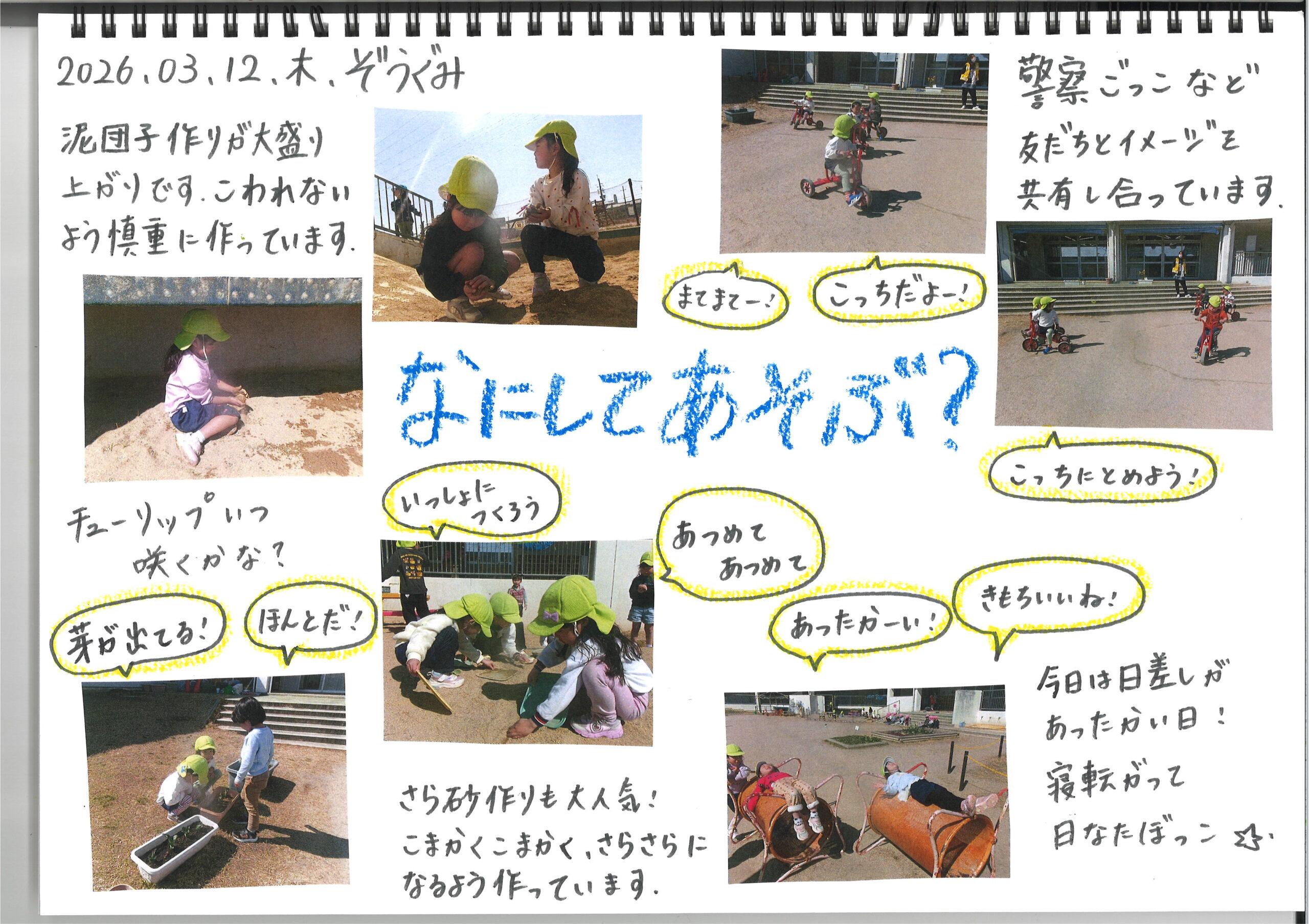 3月12日(木)今日の様子 公開日: 2026年3月12日更新日: 2026年3月12日著者: kabutodaiカテゴリー: 兜台保育園園ブログ ひよこ・りす組 うさぎ組 きりん組 ぞう組 らいおん組 関連記事 8月22日(金) 今日の様子 ひよこ・りすぐみ うさぎぐみ 赤グループ 黄グループ 青グループ 公開日: 2025年8月22日更新日: 2025年8月22日著者: kabutodaiカテゴリー: 兜台保育園園ブログ 6月15日(月)今日の様子 りすぐみ 水遊び 「冷たいねー」 「シャワシャワー」 うさぎぐみ 水遊び 室内遊び 「雨だ雨だー […] 公開日: 2020年6月15日更新日: 2020年9月9日著者: kabutodaiカテゴリー: 兜台保育園園ブログ 12月2日(水) 今日の様子 ひよこぐみ りすぐみ うさぎぐみ きりんぐみ ぞうぐみ らいおんぐみ 公開日: 2020年12月3日更新日: 2020年12月3日著者: kabutodaiカテゴリー: 兜台保育園園ブログ