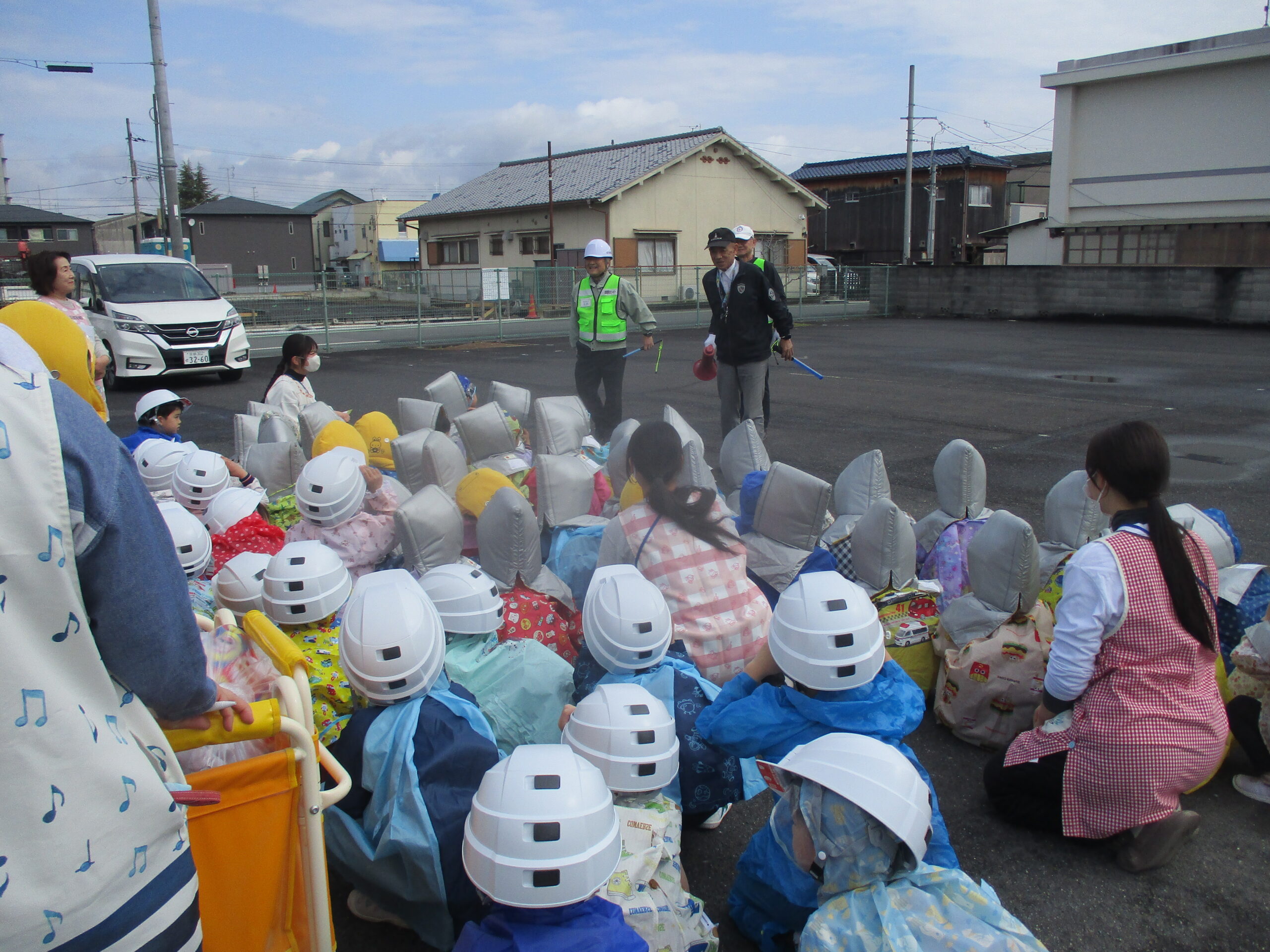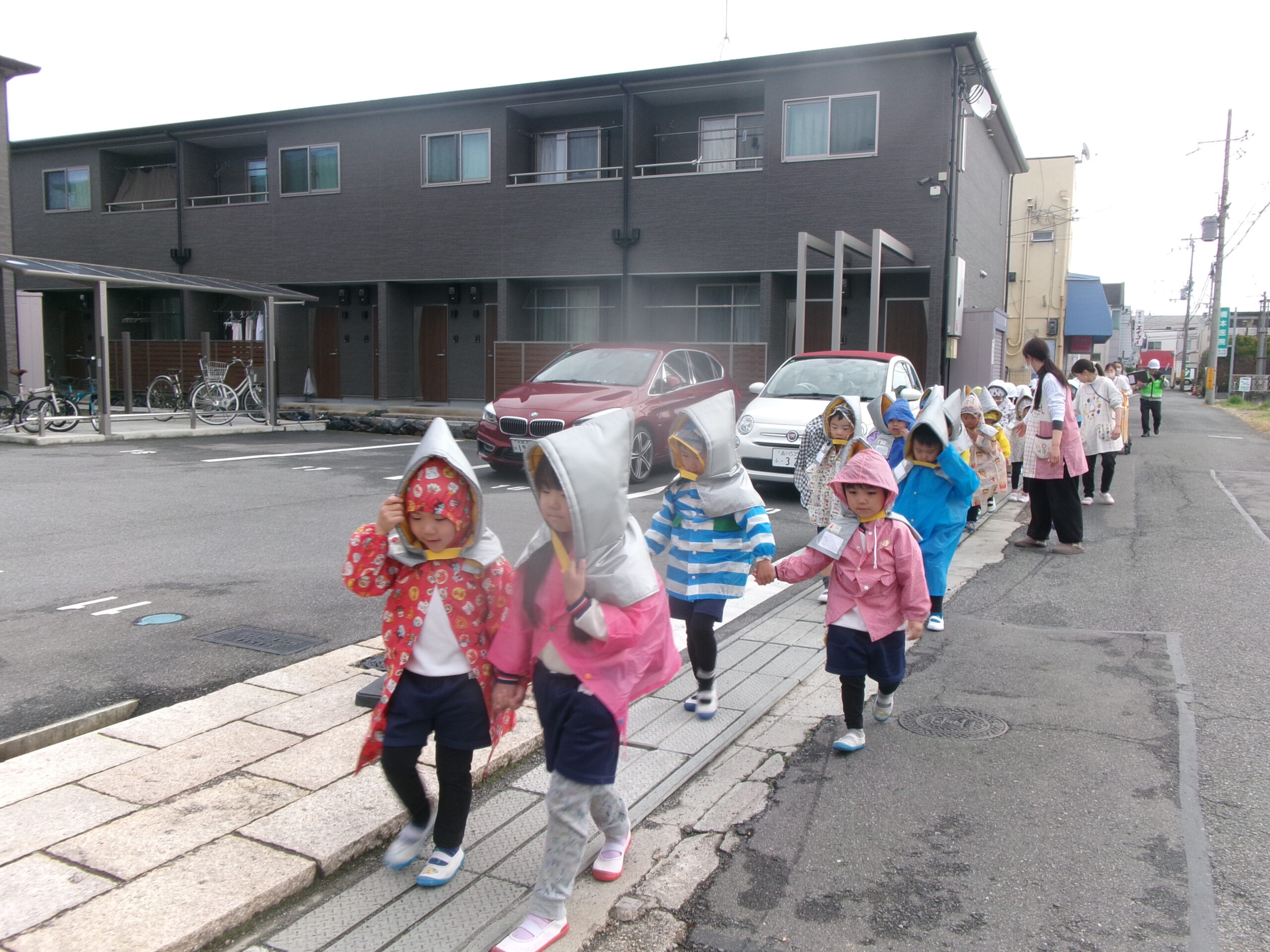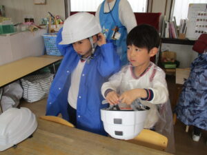避難の放送が入り、レインコート、防災頭巾(0~4歳児)、ヘルメット(5歳児)を被り