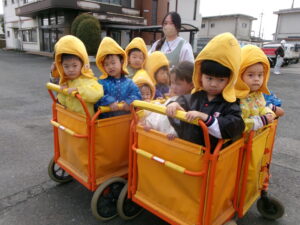 幼児は歩いて避難、乳児は散歩車に乗って木津保健センターまで避難しました。
