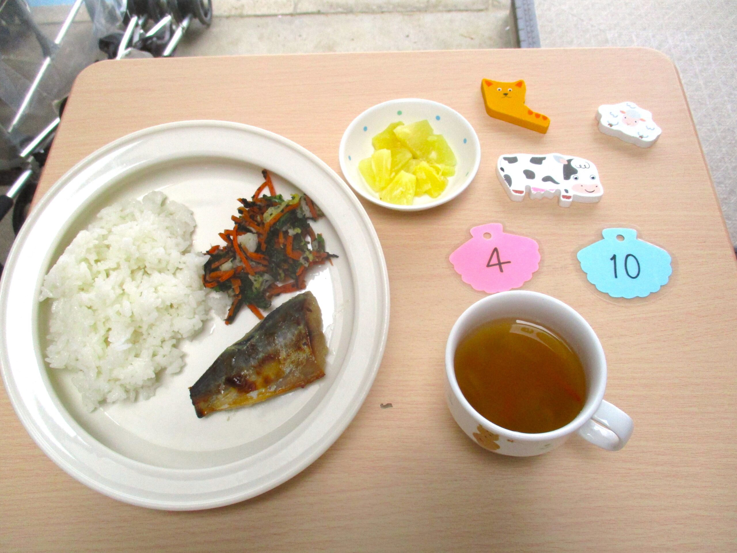 2026年4月10日(金) 公開日: 2026年4月10日更新日: 2026年4月10日著者: aikouカテゴリー: 愛光こども園, 愛光こども園給食献立 *今日の給食* ・ごはん ・サワラの西京焼き ・磯和え ・みそ汁 ・パイン *今日のおやつ* ・お茶 ・ひじきおかかおにぎり