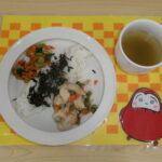 *今日の給食* ・ごはん ・高野豆腐と野菜の煮物 ・青菜のお浸し ・みそ汁 ・ひじきふりかけ *今日のおやつ* ・お茶 ・いちごムース