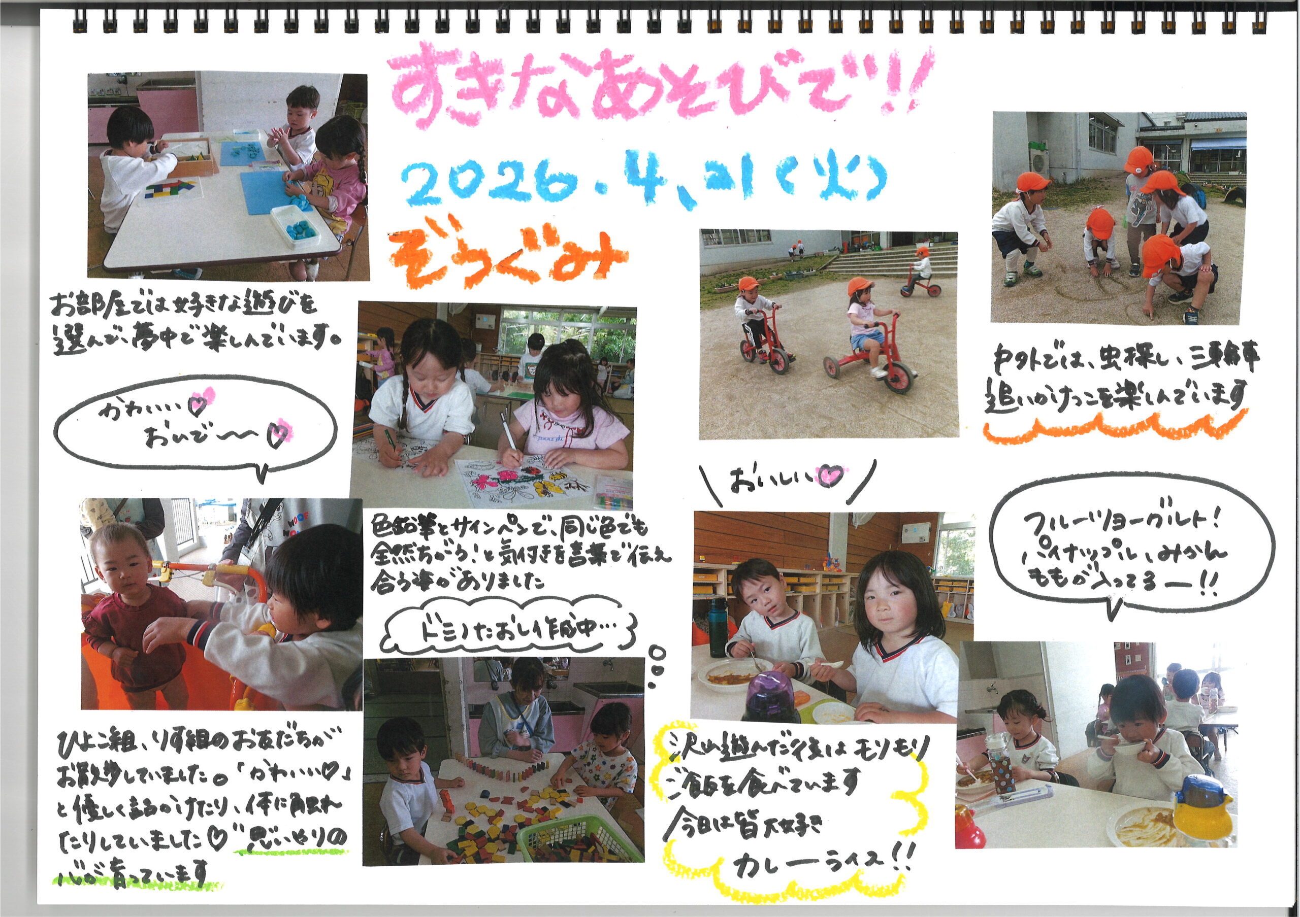 4月21日(火)今日の様子 公開日: 2026年4月21日更新日: 2026年4月21日著者: kabutodaiカテゴリー: 兜台保育園園ブログ ひよこ・りす組 うさぎ組 きりん組 ぞう組 らいおん組 関連記事 2月6日(金)今日の様子 ひよこ・りす組 うさぎ組 きりん・ぞう組 らいおん組 公開日: 2026年2月6日更新日: 2026年2月6日著者: kabutodaiカテゴリー: 兜台保育園園ブログ ほうれん草の種って…赤いの?! 発見・気付きが沢山!! 公開日: 2026年2月2日更新日: 2026年2月2日著者: kabutodaiカテゴリー: 兜台保育園, 兜台保育園園ブログ 12月6日(月)今日の様子 ひよこぐみ りすぐみ うさぎぐみ きりんぐみ ぞうぐみ らいおんぐみ 公開日: 2021年12月6日更新日: 2021年12月6日著者: kabutodaiカテゴリー: 兜台保育園, 兜台保育園園ブログ