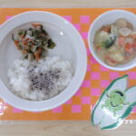 主食・・・ごはん 主菜・・・ウインナーの豆乳シチュー 副菜・・・ツナの海藻サラダ じゃこゆかりふりかけ
