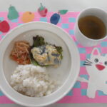 主食・・・ごはん 主菜・・・高野豆腐と野菜の煮物 副菜・・・ほうれん草とツナのマヨサラダ お汁・・・みそ汁 じゃこふりかけ